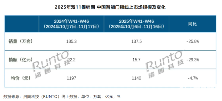 11月26号消息,洛图科技最新公布了2025年双11大促期间中国智能门锁市场的情况,2025年10月6日-11月16日,中国智能门锁线上市场的销量为137.5万套,与2024年同期(2024年10月7日-11月17日)相比下降25.8%;销额为15.7亿元,较2024年同期下滑29.3%。