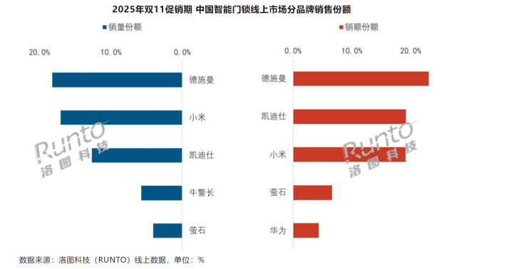 在品牌竞争方面,2025年双11大促期,TOP4品牌的销量合计份额达53.7%,较2024年同期提升了约3.3个百分点。具体来看,德施曼位列线上市场的销额与销量双维度第一,销额份额达23.0%。德施曼当前主打的核心竞争力是AI技术,通过AI大模型与门锁的深度融合,实现产品安全性与便捷性的升级。小米在主流电商渠道的销量位居第一。“全价位覆盖”和“生态联动”是小米今年的运营策略。