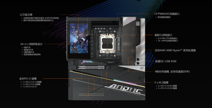 个性化与实用性兼备,主板正面配备5英寸Edge View LCD屏幕,玩家可自定义显示内容彰显个性。背部I/O接口丰富全面,包含双USB4端口(最高40Gbps,视CPU而定)、USB-C 20Gbps/10Gbps端口各一、八个USB-A 10Gbps端口、HDMI接口及音频插孔,前置USB-C 20Gbps端口进一步拓展连接便利性,全方位覆盖各类外设接入需求。