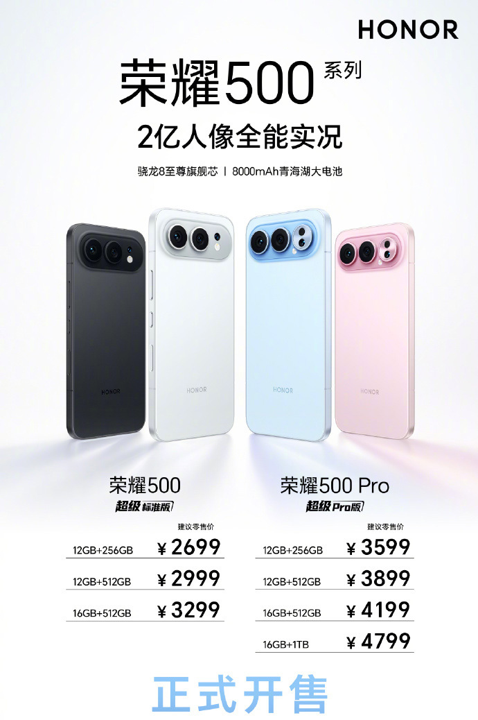 荣耀500系列已经全面开售,该系列手机表现十分全面,在颜值、游戏、续航、影像等方面,都有着神机级别的优秀体验。在存储涨价的环境下,荣耀500系列保持了一贯的超值顶级,标准版起价2699元,Pro版起价3599元,堪称是良心定价。