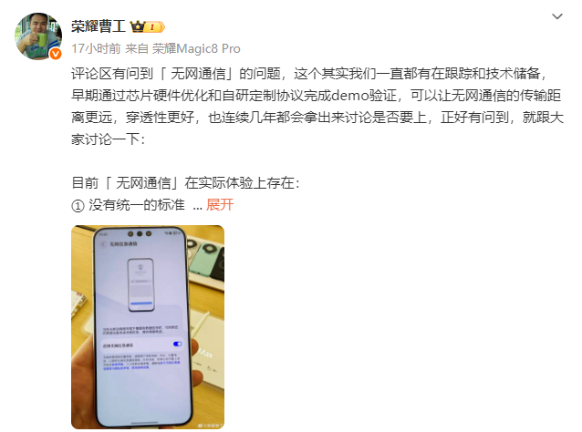 荣耀研发工程师@荣耀曹工也对此发表了看法,其表示无网通信没有统一的标准协议,各家不互通。虽然大家宣传的最大通信距离可以达到几公里,但是在实际的现实环境下大打折扣;不互通,也导致很难在范围内找到对应可以Mesh扩展的设备。在无网通信环境中,现有通信的应用都无法互通,目前各家在用户界面的设计也不统一,实际操作和体验都不好。
