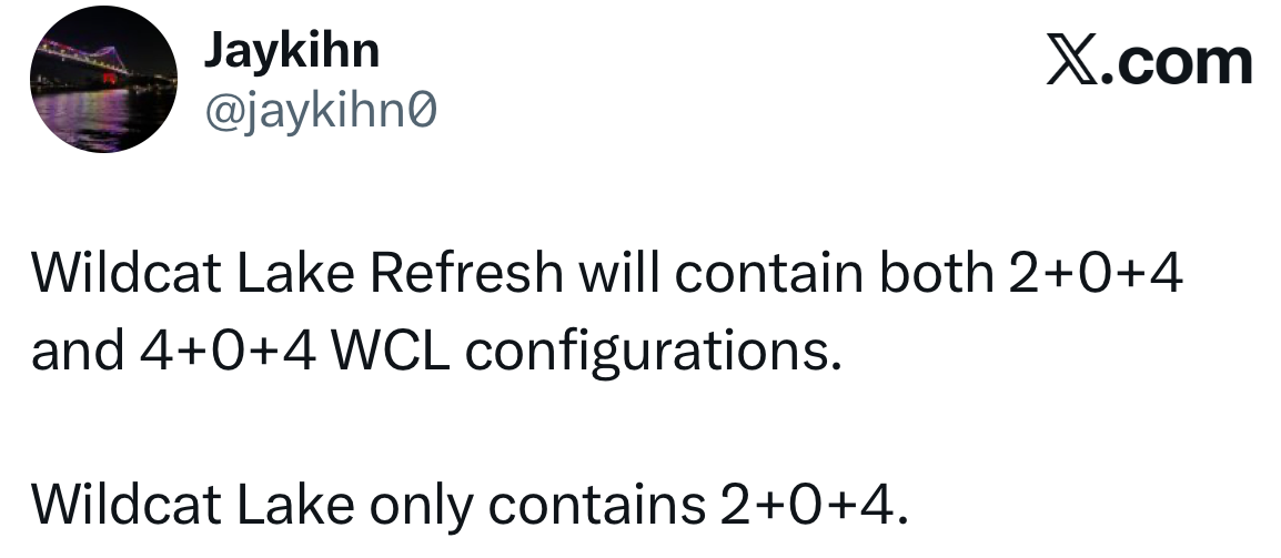根据@jaykihn0最新爆料显示,英特尔低端处理器系列“Wildcat Lake”将推出迭代升级的“Refresh”刷新版本。此次更新的核心亮点的是,在原版2P(性能核)+ 0E(能效核)+ 4LPE(超低功耗核)的基础配置之外,新增4P+0E+4LPE的高阶CPU规格,进一步提升性能上限。