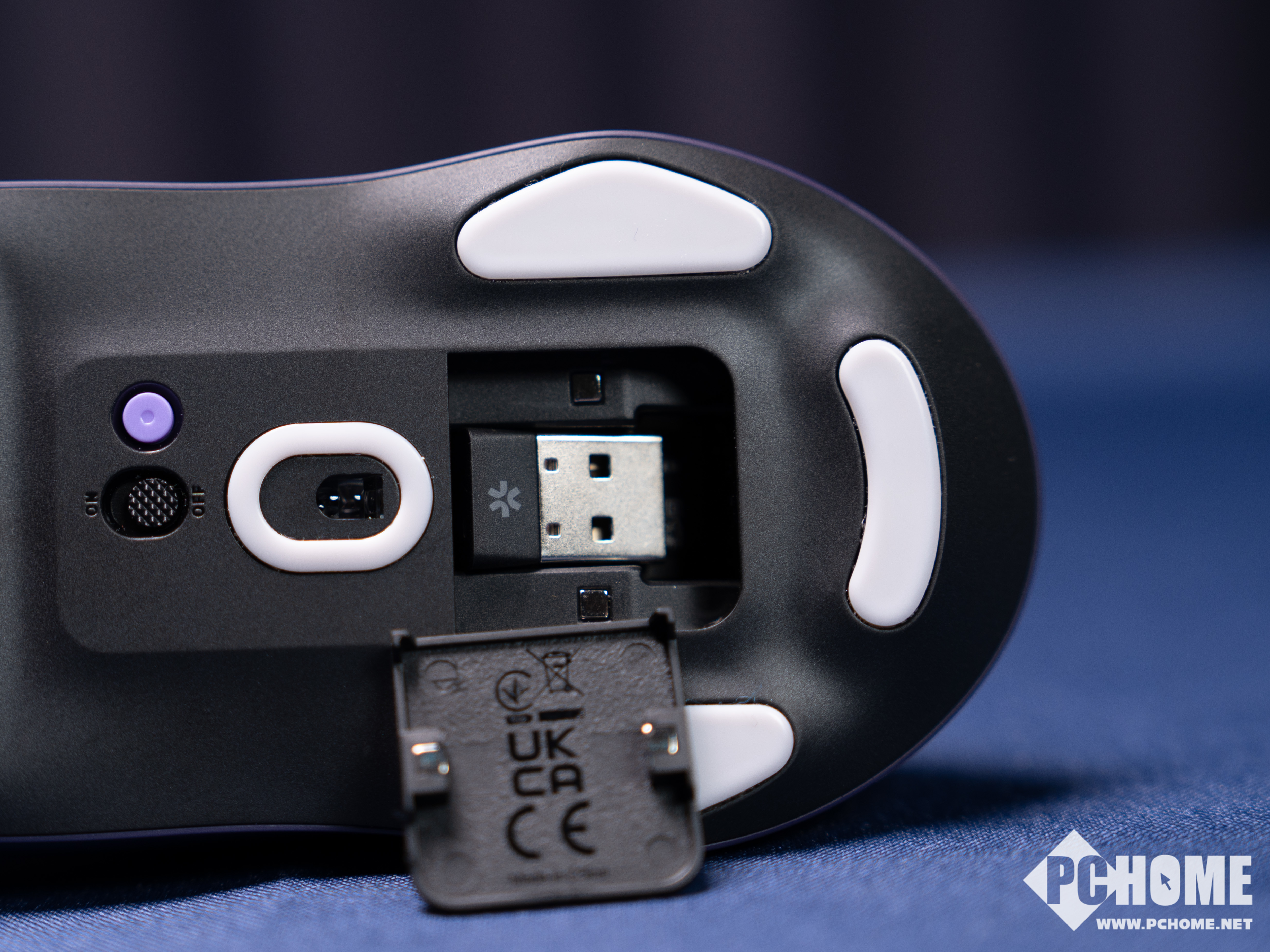 机身底部配备大面积特氟龙脚贴,降低滑动阻力,提升移动顺滑度,可替换磁吸式底盖,内置Nano接收器收纳仓,解决外出携带时接收器丢失的痛点。依旧采用经典键位布局,左右键、滚轮、DPI加减键、两个分离式侧键及底部DIY按键,共10个可自定义按键。