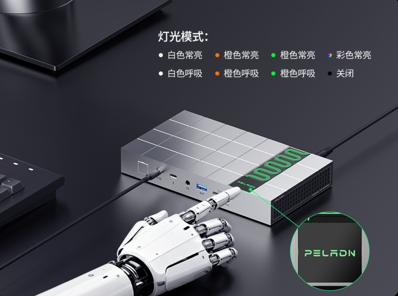 扩展坞内部集成PCIe 4.0×4规格的M.2 2280硬盘位,用户可自行加装固态硬盘,将扩展坞从单纯接口扩展升级为存储扩容中心,适合视频编辑者快速存取大型素材库。独特的是顶部搭载智能RGB灯效系统,通过触摸即可切换多种光效模式,兼顾科技感与个性化。双系统兼容性(Windows/macOS)覆盖主流创作环境。