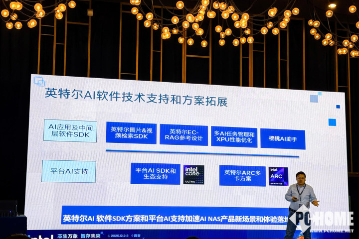 在这样的技术背景和用户需求下,英特尔提出的“AI NAS”概念迅速获得产业链响应,并在一年多的时间里从理念演进为可落地的全栈生态体系。12月3日,2025英特尔AI NAS解决方案峰会在西安成功举行。峰会围绕“芯生万象 智存未来”为主题,英特尔携手生态伙伴及三十余家渠道客户,共同展望AI NAS未来发展方向,并展示了面向中小企业、消费者和专业用户,赋能新场景、加速产品落地的最新技术方案。