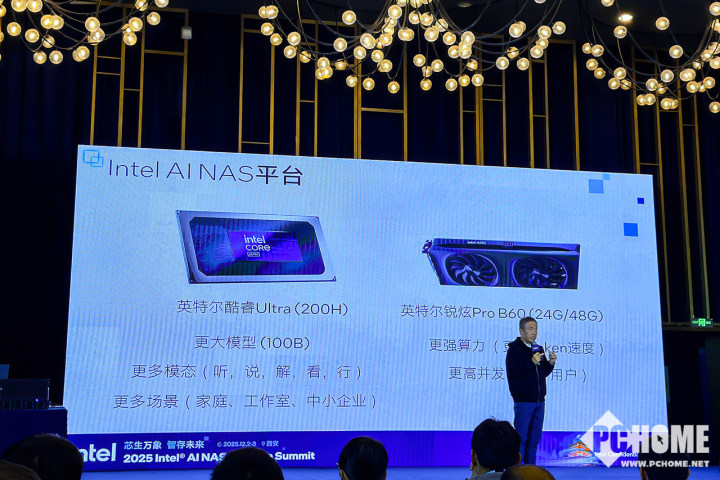 在生态伙伴层面,厂商的落地产品正验证着这条路线的可行性。本次峰会上,绿联、极空间、铁威马、畅网、飞牛等多家厂商,发布和展示了一系列基于英特尔酷睿Ultra处理器和英特尔锐炫B60显卡的多场景AI NAS解决方案,旨在打造智能本地数据存储创新模式,为中小企业和家庭等用户提供集存储、管理、算力于一体的智能本地算力中心。