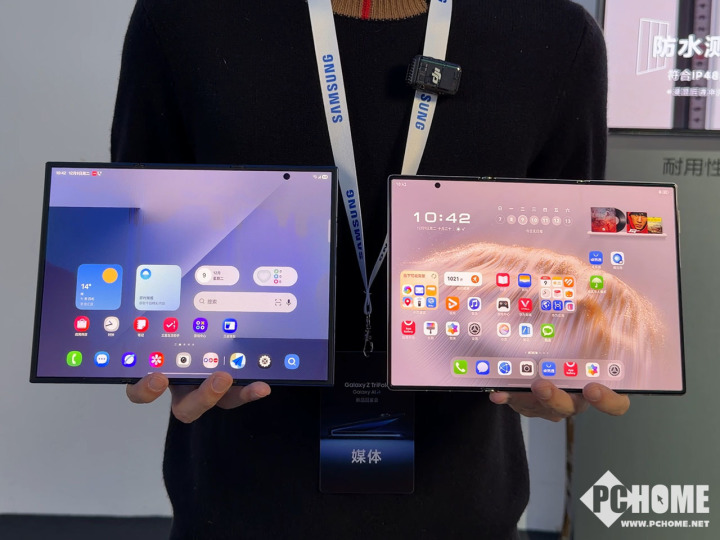 至于厚度方面,三星Galaxy Z TriFold展开厚度3.9毫米,比华为厚了0.3毫米,闭合厚度12.9毫米,比华为Mate XTs厚0.1毫米,纸面数据有差距,实际使用中几乎感觉不到。