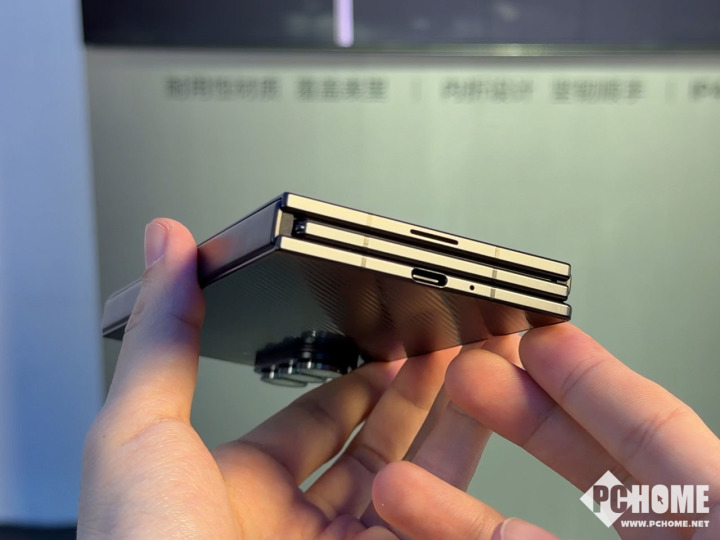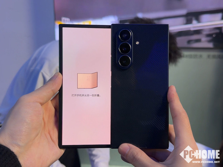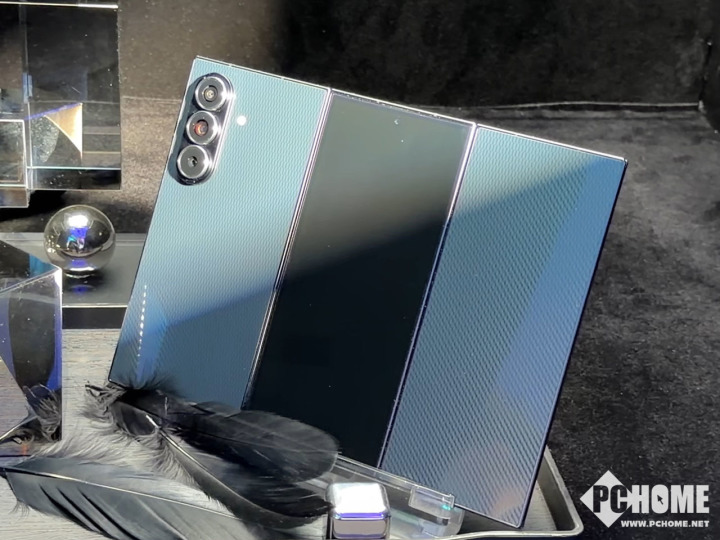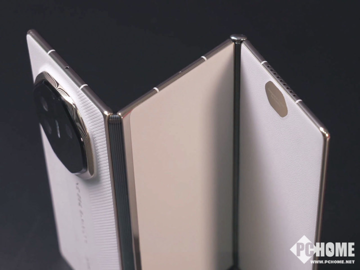 三星Galaxy Z TriFold延续Z Fold7的硬朗纤薄商务风格,机身以直线元素为主,闭合时顶底双端棱角分明、严丝合缝,呈现几何美感。其采用内折+内折的方式,以中间屏幕为基点,两侧区域均向内折叠。