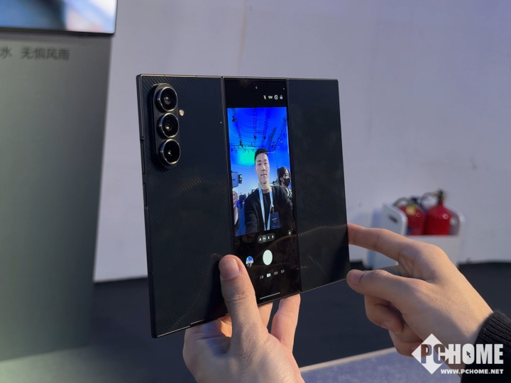 折叠屏设计师可以通过外屏调用后置镜头自拍的,从现场实际体验来看,三星仅能在完全展开状态下使用后置自拍,折叠单侧屏幕时无法开启,展开三屏基本要双手持机了,灵活性不及华为,后者的后置自拍功能使用场景更灵活,可以在“双屏”模式下进行后置自拍,单手即可持机完成。