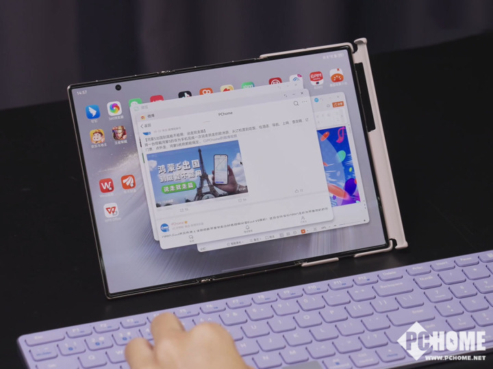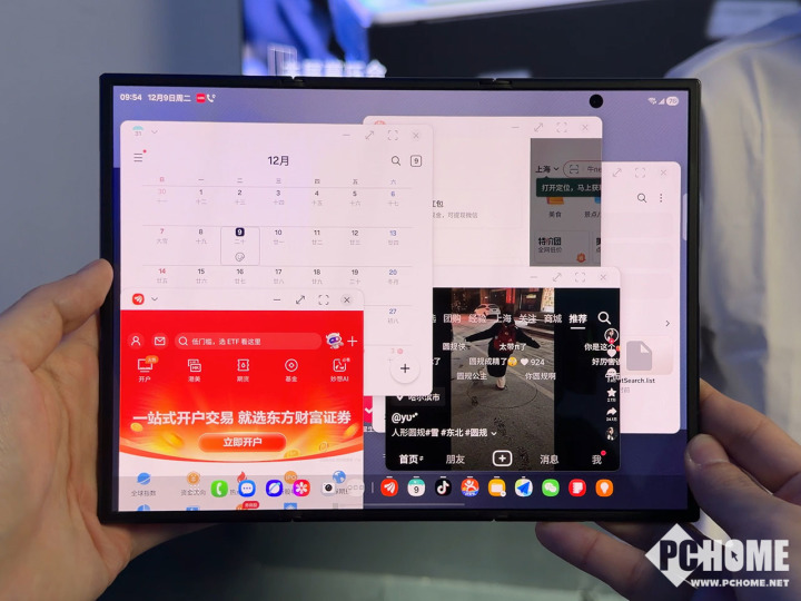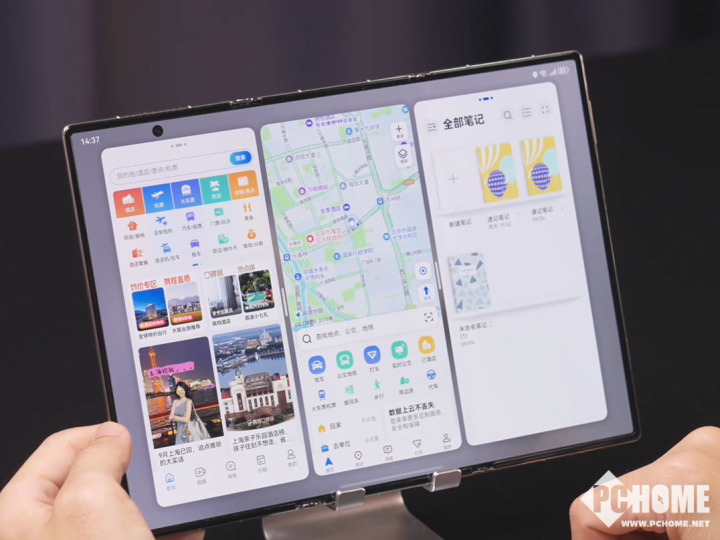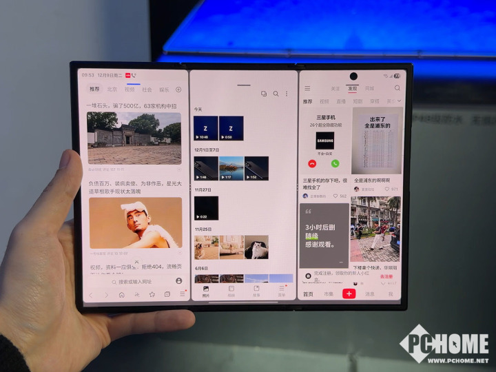 在多任务处理上,三星提供了三分屏功能,可以同时开启三个互不干扰的竖屏应用,也可以通过多窗口视图,自由调节应用的尺寸、排列应用的布局。以上这些应用并行显示和大屏适配,华为Mate XTs也提供了相应支持,毕竟两代产品一年多的适配,已经完成了日常应用的适配。