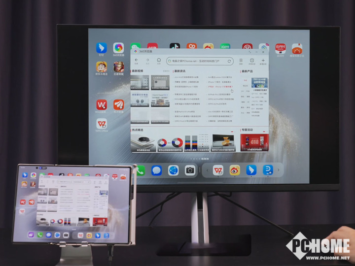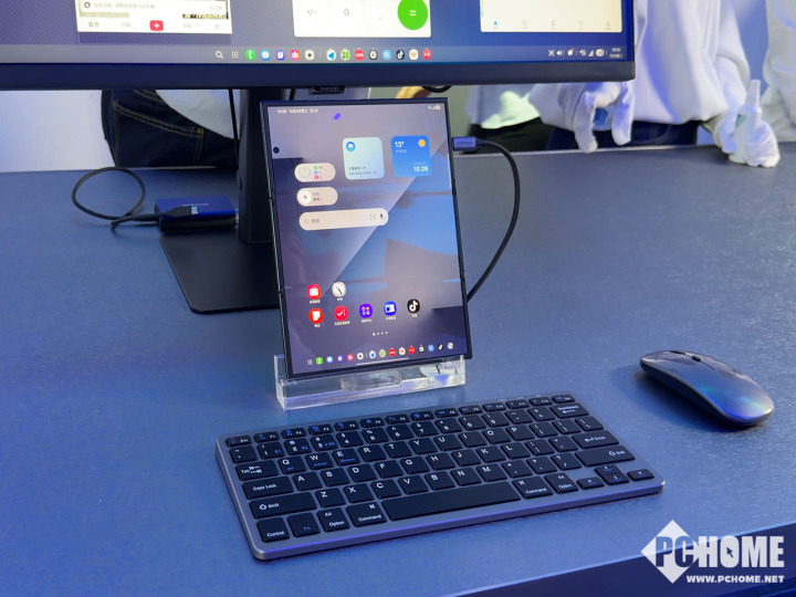 当然,也可以通过有线直连外部屏幕的方式,来实现在大屏中启动DeX模式,开启后可获得双屏协同体验,应用可在两块屏幕间任意拖放,连接上键鼠,就有着PC般的高效跨屏操作。
