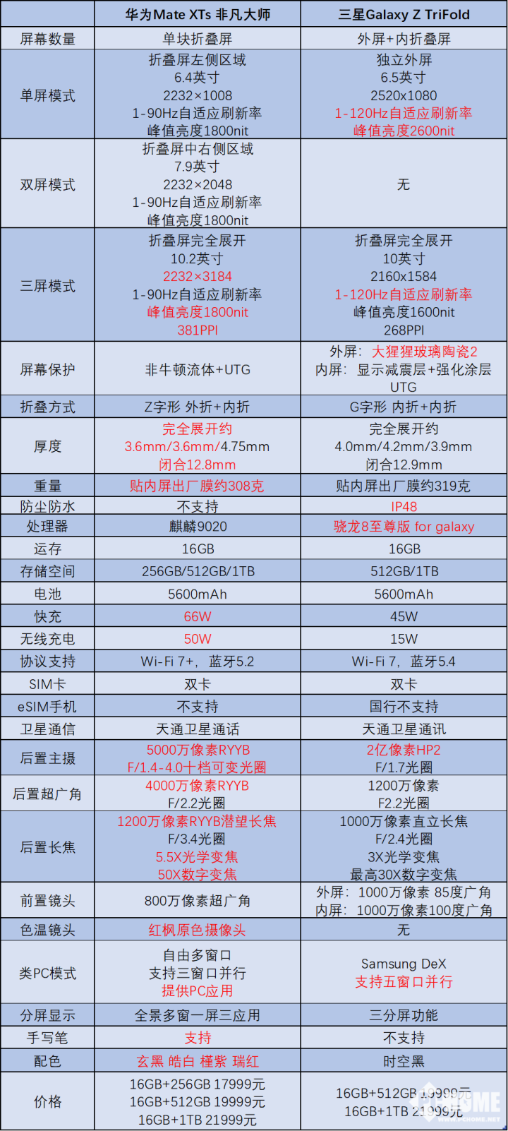 在实际感受两部手机过后,我们可以明确表示,两部三折叠手机是两个不同赛道的产品,有着不同的侧重点,以下就是我们提炼出的关键差异性规格对比。