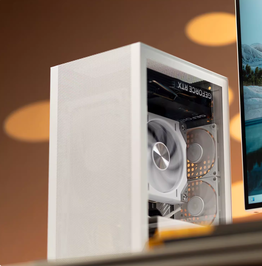 主体尺寸为210×166×300mm,体积10.4L(含底座增至11.16L),占地面积仅0.034m²,适合桌面紧凑的空间。支持最大长度205mm、厚度52mm、高度135mm(不含挡板)的显卡,例如RTX 4060显卡。纯白款采用底部银色撞色设计,提升视觉辨识度。整体采用主板翻转布局,显卡置于机箱上方,搭配横向贯穿风道优化散热效率;默认右侧透玻璃面板,并且支持左右侧板互换。