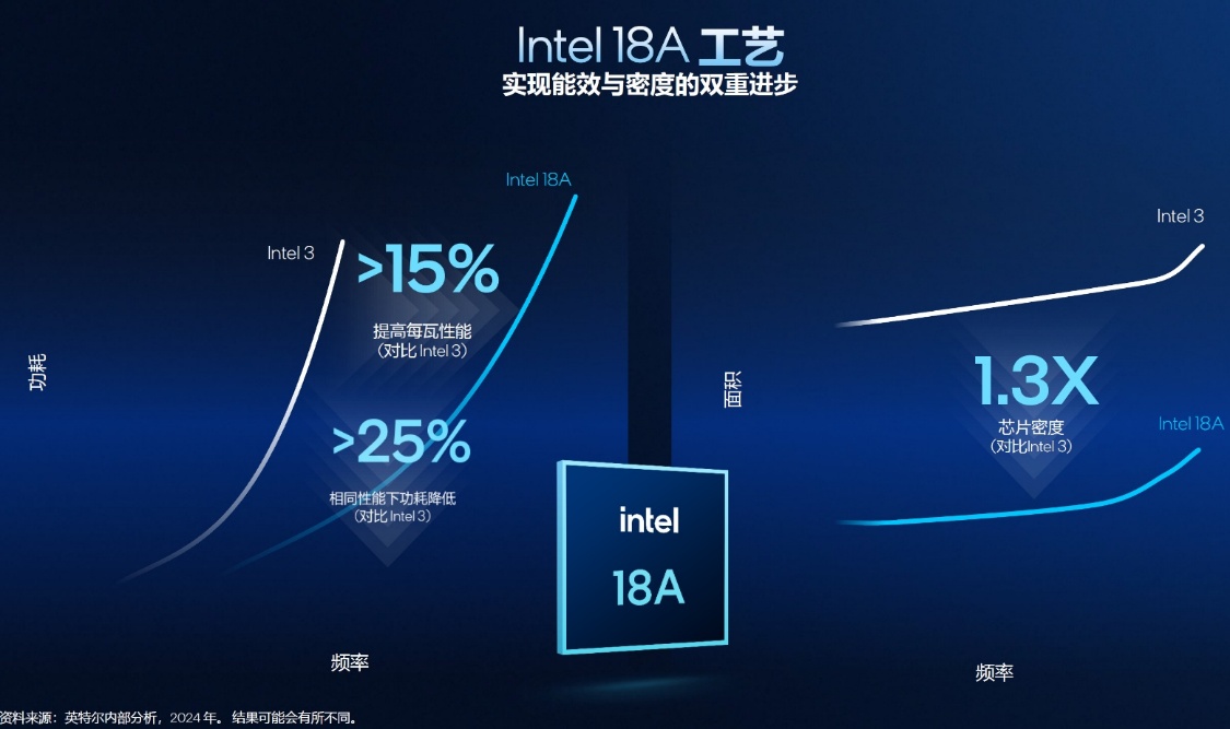 这款芯片之所以备受期待,源于其作为AI PC时代标杆产品的全面革新。它是英特尔首款采用18A先进制程打造的客户端芯片,RibbonFET全环绕栅极和Power Via背面供电两项堪称革命性的技术加在一起,让18A制程相比Intel 3制程的每瓦性能提升高达15%,芯片密度提升约 30%,能效比大大提高。