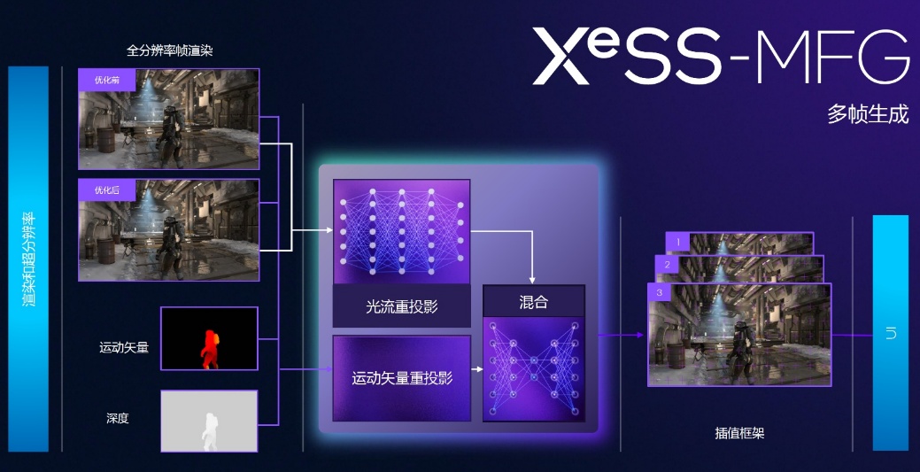 XeSS 2的核心在于三项突破性技术:AI超分辨率、AI多帧生成(MFG)以及XeLL低延迟技术。前者通过智能算法,将较低分辨率渲染的画面重建为清晰的高分辨率图像,在几乎不损失画质的前提下大幅减轻GPU负担;后者在游戏生成的原有两帧画面之间,智能地推算并插入最多四帧画面,从而让帧率实现倍增,将流畅度推向新的极致。与此同时,配套的XeLL低延迟技术能确保高帧率下的操作响应依旧跟手,避免“帧数虽高、手感迟滞”的尴尬。