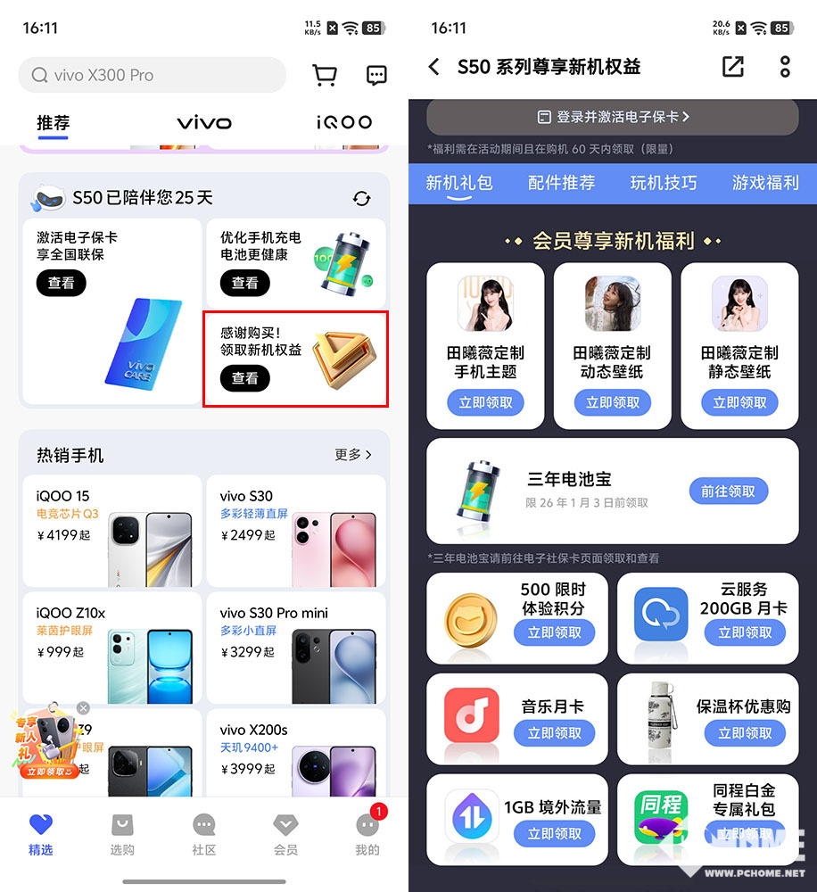 如果你粉田曦薇的话,更是绝对不能错过这份专属宠爱,入手vivo S50系列就能领取田曦薇定制主题,软萌又灵动的设计直接把治愈感拉满。不过要记好领取时间节点,必须在购机60天内,且要在2026年6月30日前完成领取才有效。领取步骤超简单,新机主界面点开“vivo官网”,首页下拉找到“领取新机权益”图标,点进去就能一键解锁定制主题和定制动态壁纸,小白也能轻松操作。