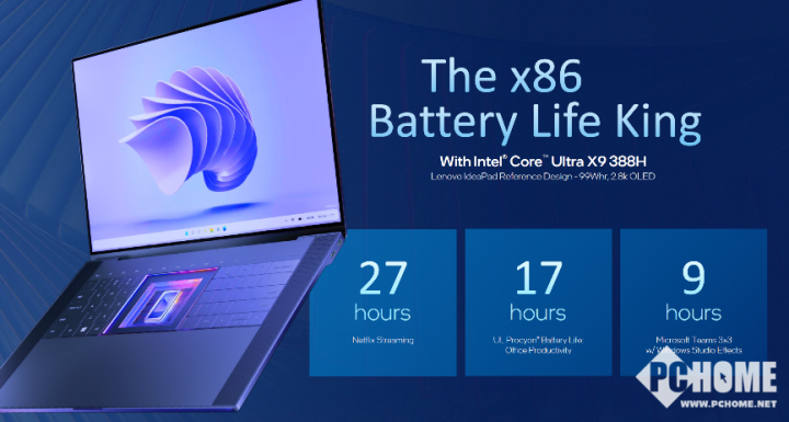 与此同时,得益于Intel 18A制程带来的能效优势,第三代英特尔酷睿Ultra平台在续航表现上实现了显著提升,官方数据显示,部分型号可实现高达27小时的持久续航。这意味着AI计算不再是电量负担,而成为可以全天候运行的常态能力,为移动生产力提供了现实可行的技术基础 。