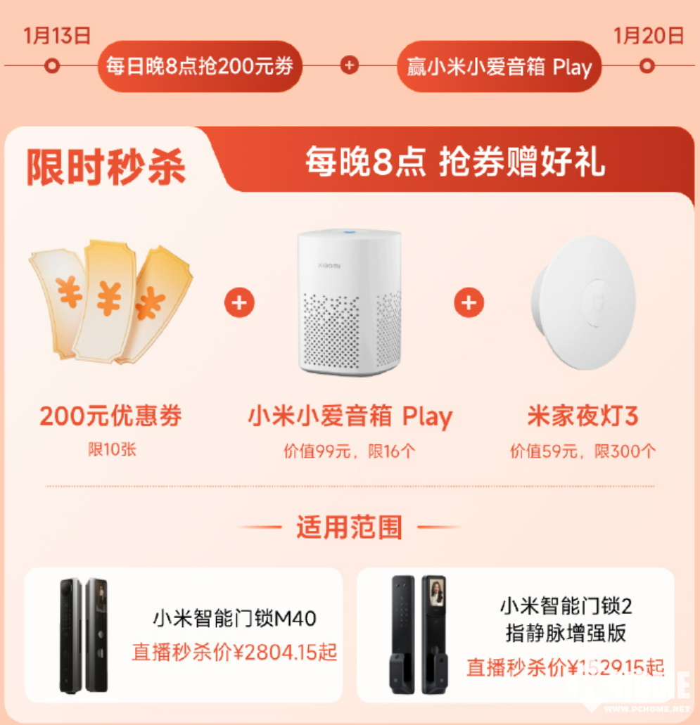 1月14号消息,小米商城宣布,一直到1月20日,小米商城直播间每晚8点将会有智能门锁秒杀活动,购买指定门锁限量抢200元优惠券、购买指定门锁赠小米小爱音箱Play。