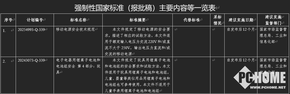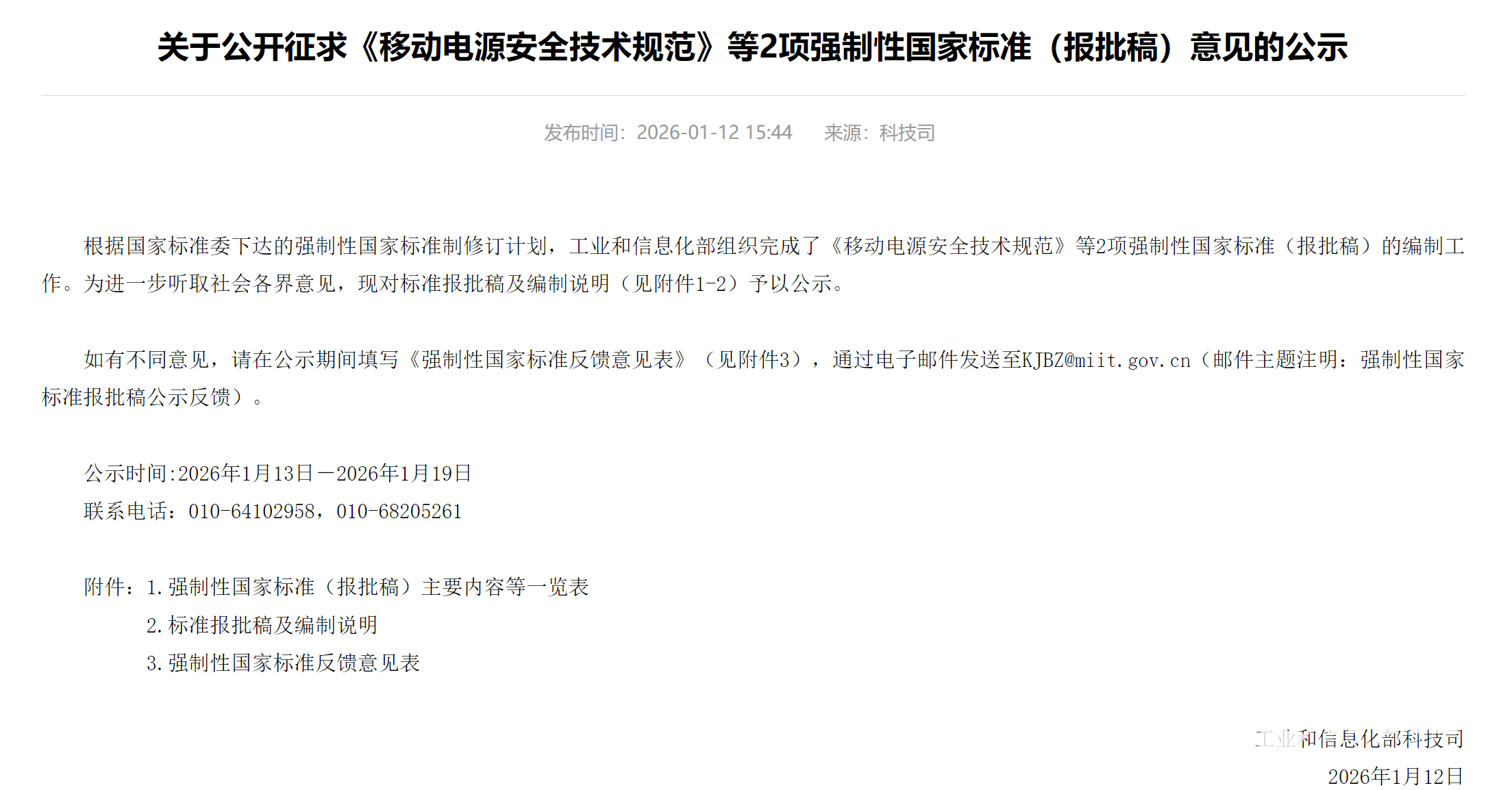 近日,国家工业和信息化部发布了“关于公开征求《移动电源安全技术规范》等2项强制性国家标准(报批稿)意见的公示”,公示时间为2026年1月13日至2026年1月19日。为进一步听取社会各界意见,对标准报批稿及编制说明予以公示。