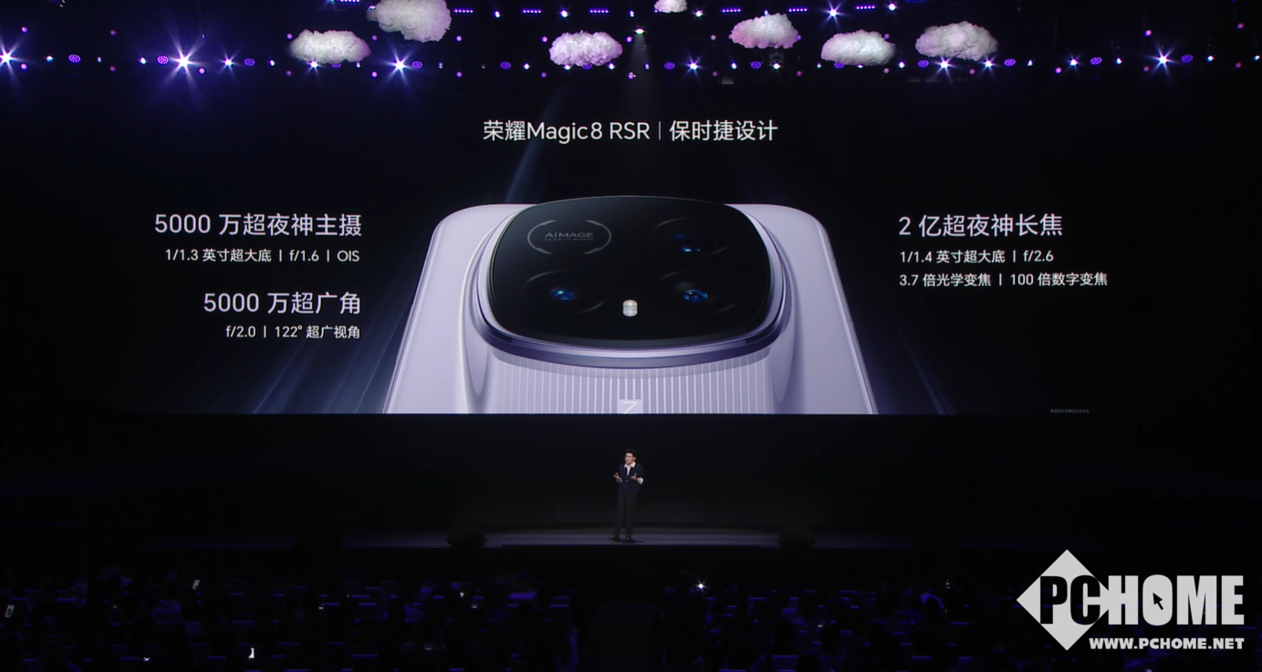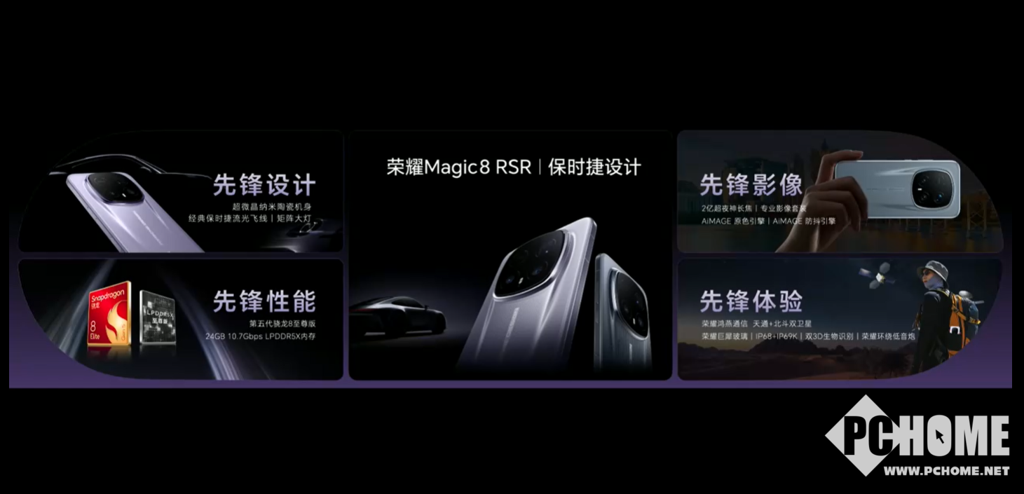 荣耀Magic8 RSR保时捷设计则是一款超大杯影像旗舰,该机设计上保持超跑式的流线型造型,使用超微晶纳米陶瓷机身,放弃了原本的八角形镜头设计,转而采用了更平滑的设计,镜头模组则是保时捷经典的大灯模组造型。月光石与板岩灰两种质感配色,由斯图加特原厂大师精心调色,尽显动感与优雅气质。