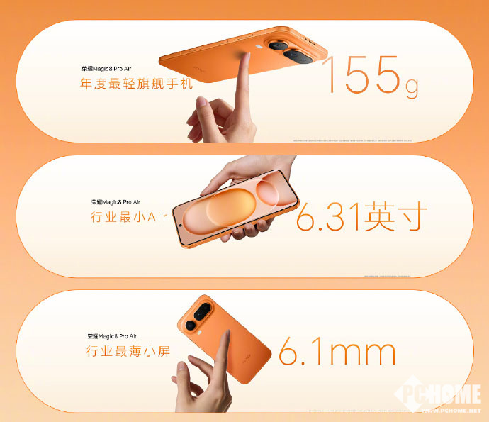 荣耀Magic8 Pro Air注重纤薄性呈现,整机厚度控制在了6.1毫米,重量155克,重心居中,单手握持十分轻盈,让握持手机不再厚重。荣耀Magic8 Pro Air只是纤薄并不单薄,采用蝉翼架构航空铝一体化中框,视觉美观的同时保持了足够的结构强度,无惧各种弯折挤压。