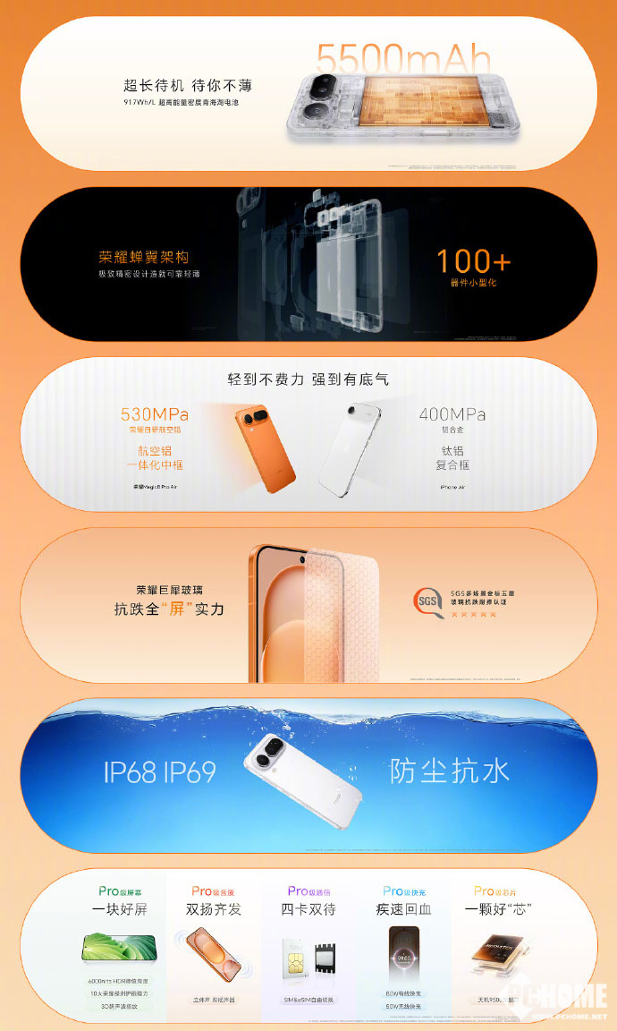 在续航方面,荣耀Magic8 Pro Air在6.1英寸的机身下,放下了一块5500mAh的青海湖电池,具有917Wh/L的高能量密度,并搭配80W有线和50W无线快充,续航久、充电快,相比友商3000mAh出头的小电池,续航表现明显更有安全感。