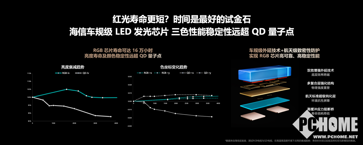 用户日常使用中,采用RGB真彩背光的海信E8S更是带来双重增益:一是节能40%以上,长期使用可显著降低电费支出,更契合绿色家居需求;二是硬件级减少42%有害蓝光,实现护眼不偏色,老人、儿童长时间观看也更安心。稳定性方面,搭载乾照光电全自研车规级发光芯片,经85℃高温、60mA大电流极限测试,红光芯片寿命突破16万小时,超十年不褪色,耐用性远超易老化的量子点方案。