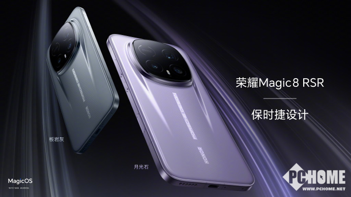 荣耀Magic8 RSR延续RS系列对极致美学的追求,引入保时捷设计联合打造的专属外观。机身背部采用标志性的“流光飞线”设计语言,灵感源自保时捷超跑引擎盖隆起线条,配合板岩灰与月光石双配色,呈现出兼具速度感与高级感的视觉张力。镜头模组以精密多层切割工艺打造,中央镌刻“HONOR Porsche Design”字样,仪式感拉满。