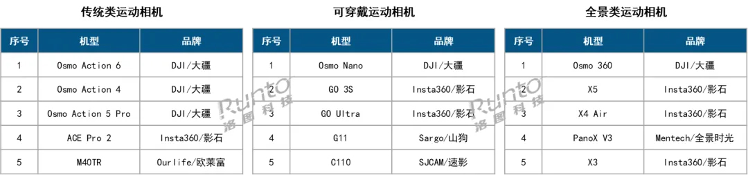 畅销机型榜单同样被头部品牌包揽。传统类TOP3机型为大疆Osmo Action 6、4、5 Pro系列;可穿戴类市场中,大疆Osmo Nano位居第一,影石GO3S、GO Ultra紧随其后;全景类市场大疆Osmo 360领跑,影石X5、X4 Air、X3三款机型位列其后。