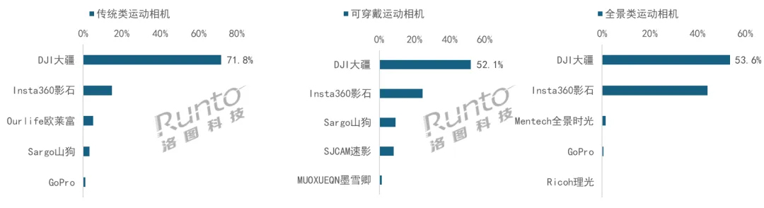品牌格局呈现高度集中态势,300元以上主流市场中,DJI大疆与Insta360影石合计拿下84.6%的销量份额。其中大疆表现尤为亮眼,以70.8%的销额份额稳居销量与销额双榜首,且在三大产品形态中均斩获销量第一。在传统类市场,大疆销量占比71.8%;可穿戴类市场占比52.2%;全景类市场仅凭Osmo 360一款单品就拿下53.6%的份额。