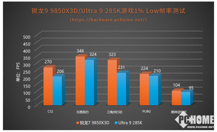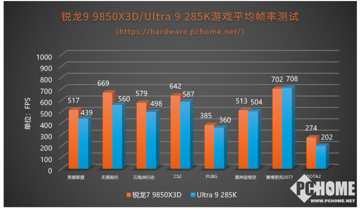 从测试结果的图表不难看出,在几款热门网游中,锐龙7 9850X3D均获得了平均帧率的领先,《无畏契约》领先多达19%,《DOTA2》中领先35%,《CS2》中领先10%,《三角洲行动》领先约16%,《英雄联盟》高出约18%,《PUBG》领先7%。两款3A游戏,《赛博朋克2077》和《黑神话悟空》,锐龙7 9850X3D和Ultra 9 285K的帧率比较接近,基本是同一性能水平。