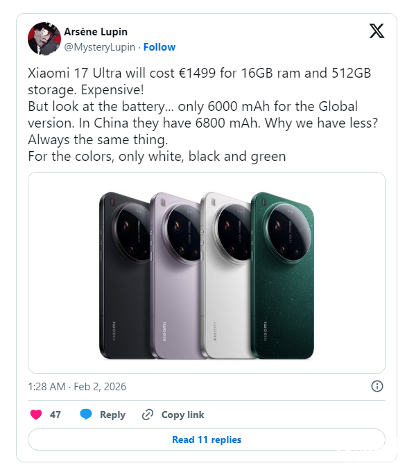 在配色方面,欧版小米17 Ultra会提供黑色、白色、星空绿三种,冷烟紫配色将无缘欧洲市场。价格方面,欧版小米17 Ultra提供16GB+512GB存储,售价1499欧元,与小米15 Ultra的欧版价格持平。但即便如此,仍有不少欧洲网友惊呼价格太贵了。如果以国行版的价格来衡量的话,那么小米17 Ultra的欧版价格确实有差距,合人民币超过12000元了,比国内贵了4500多元。