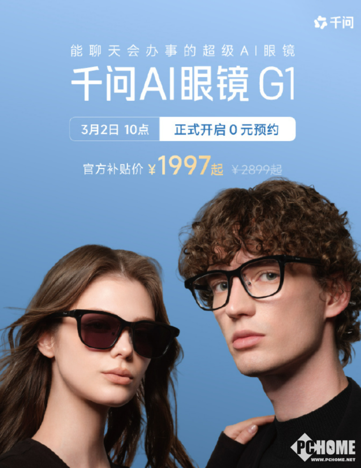 PChome 3月2号消息,阿里巴巴千问AI眼镜G1开启全渠道预约,新品首发价叠加国补后1997元起,参加预约加赠眼镜备用电池。
