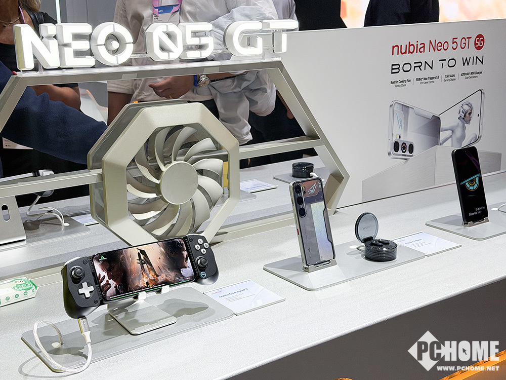 PChome现场了解到,努比亚Neo 5系列手机还可以搭配专业配件使用,努比亚提供了配套的手柄套装,连接后可固定在手机两侧,让手机直接变成一部掌机。还可以搭配nubia GT Buds耳机与nubia磁吸风扇,获得更沉浸的游戏体验。