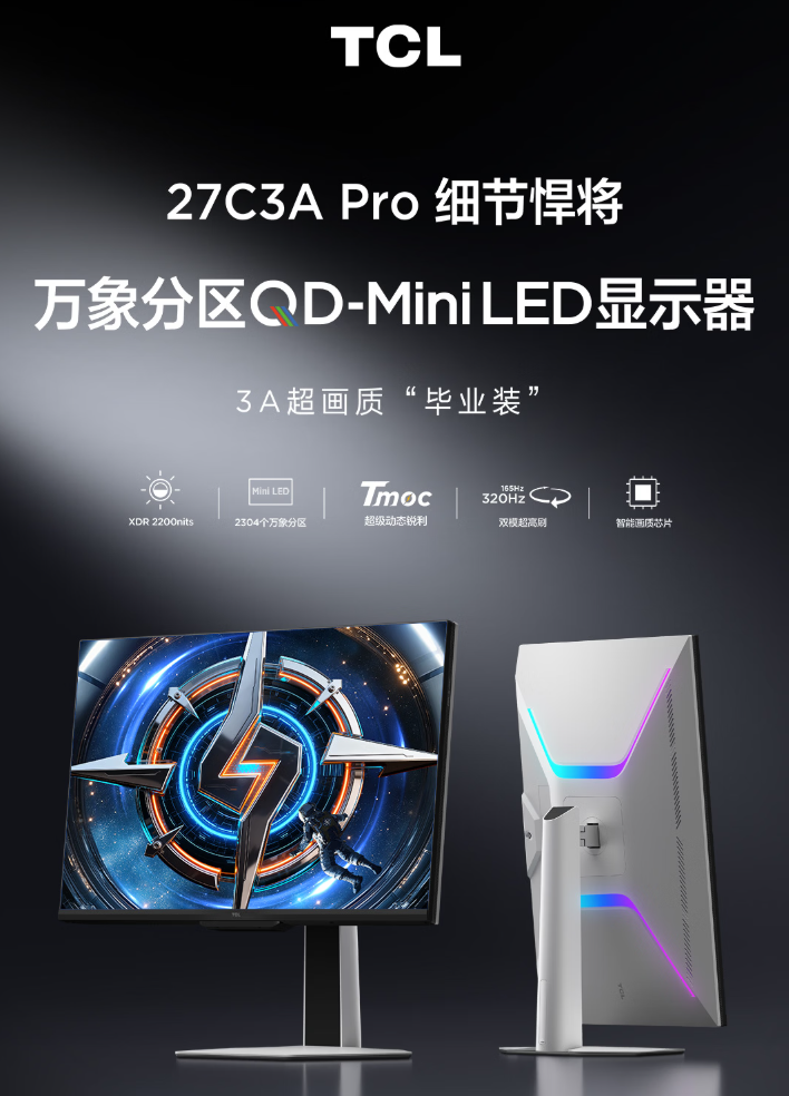 PChome3月5日消息,TCL在今天下午的发布会上正式推出了27C3A Pro QD-Mini LED显示器,定位“细节悍将”,官方称之为3A超画质“毕业装”,新品上市补贴到手价3399元。