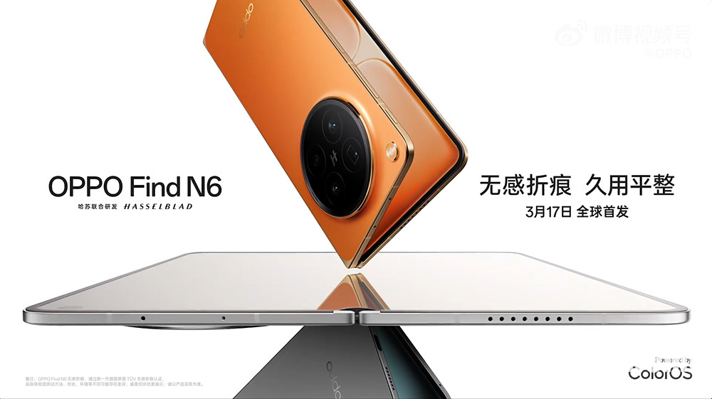 PChome 3月9日消息,OPPO正式官宣,将在3月17日19:00举办新品发布会,全新一代折叠屏旗舰OPPO Find N6将会在此正式发布,该机的设计也随之曝光。