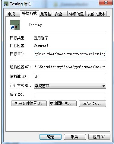 第一步,创建服务器1.更新到3.0.0.1preview版;2.找到自己的steam library中unturned的游戏目录;3.创建Unturned.exe快捷方式(名字随便起,这将是你的本地服务器,这里取名叫Testing);4.右键你的快捷方式,在目标中后边加上: -nographics -batchmode +secureserver/你服务器的名字(注意每个符号前都有空格),然后应用图中的例子是:F:\SteamLibrary\SteamApps\common\Unturned\Unturned.exe -nographics -batchmode +secureserver/Testing