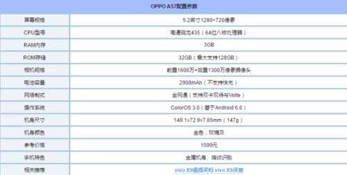 OPPO A57主打小屏,分辨率为720P入门级别,搭载入门的高通骁龙435处理器,3GB内存和32GB存储空间,拥有前置1600万像素和后置1300万像素摄像头,内置2900mAh容量电池,支持全网通等。从搭载的内存与摄像头来看,规格尚可。但1599元的OPPO A57在硬件上有2个槽点: